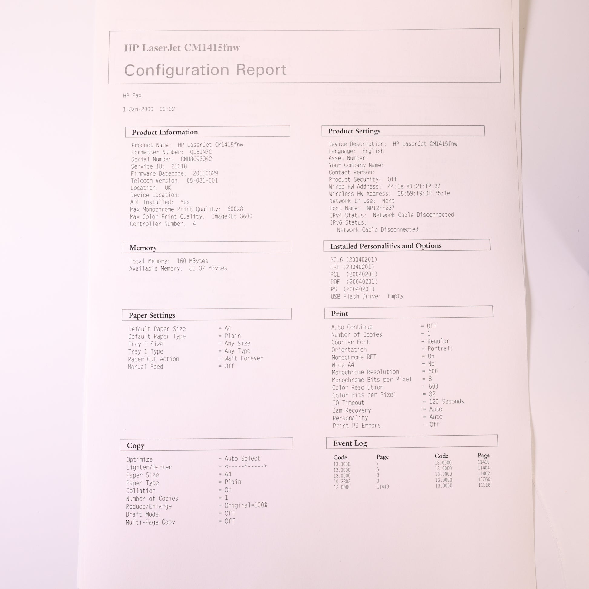 According to the printer, it has a total page count of only 15 pages. However, the Event Log does show a page count around 11,400 before going back to zero, so it's possibly been reset, or had a mainboard replacement. We can't be 100% sure of the actual page count, but we would estimate around 11,500 based on the above information.