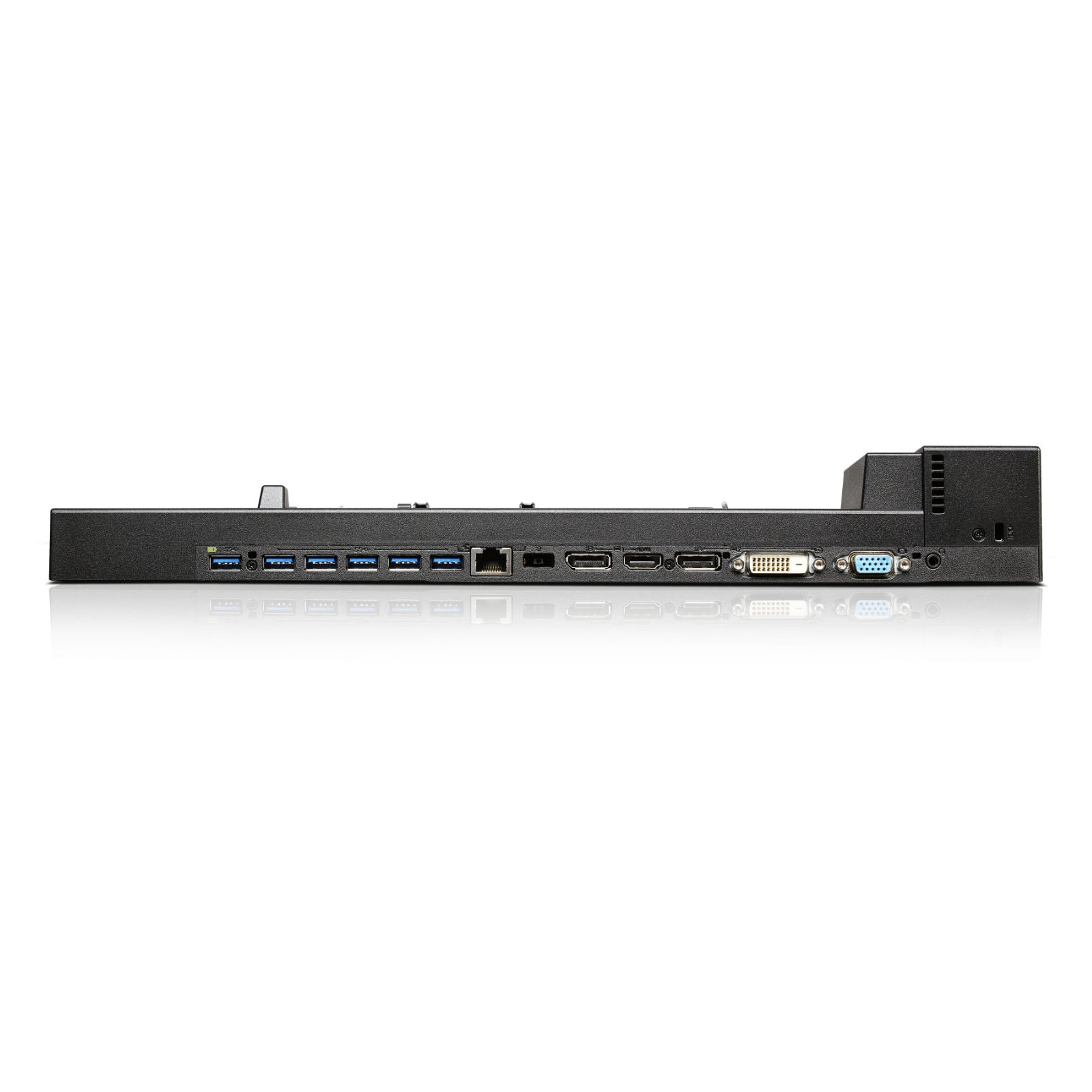 Additional ports on the ThinkPad Workstation dock include a 10/1000 Gigabit Ethernet connection, 2x display 1.2 ports, 1x DVI-D port, 1x HDMI 1.4 port, 1x stereo/mic combo audio port and 1x VGA port.
