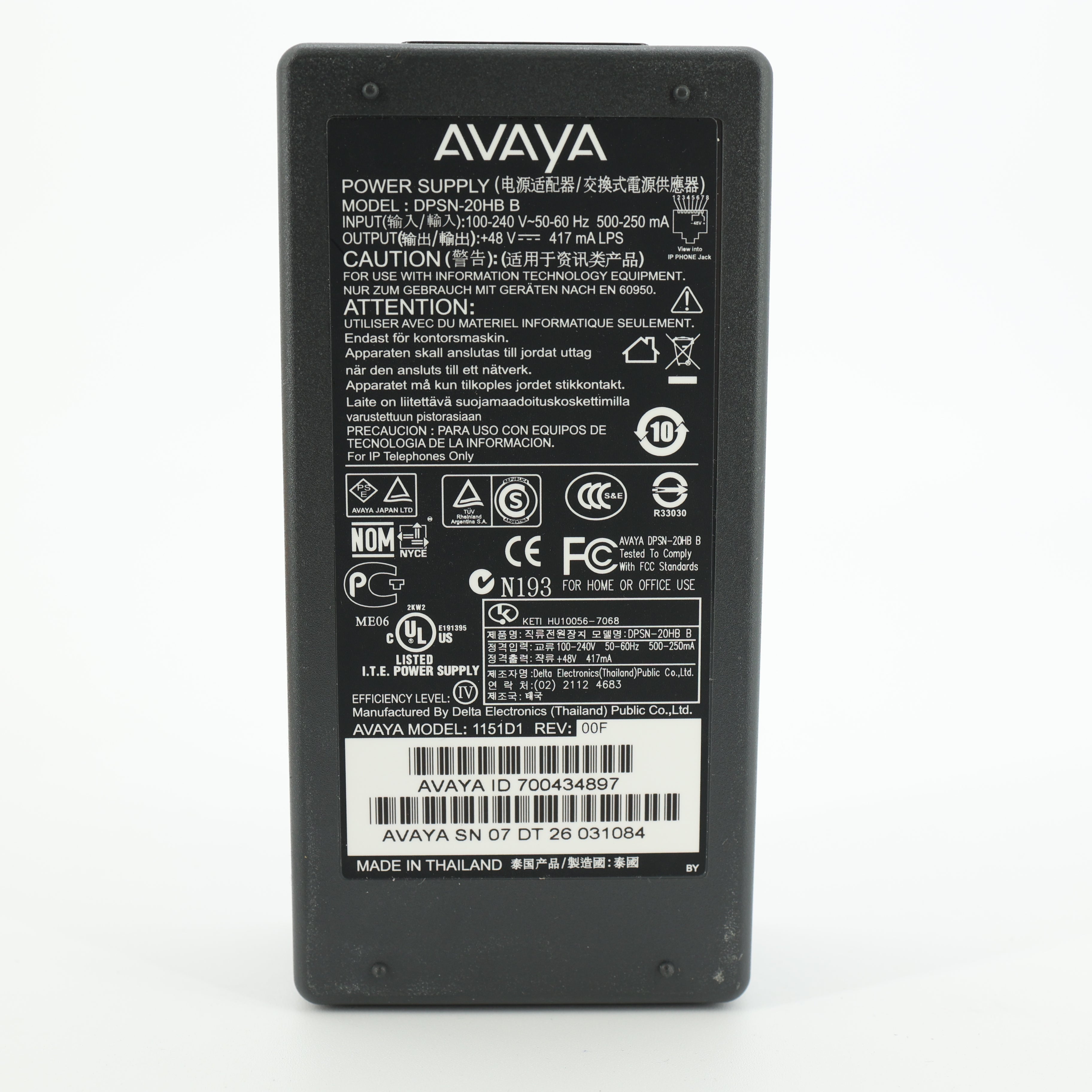 Avaya 1151D1 PoE Injector IP Phone In-Line Power Supply PSU 700434897 DPSN-20HB